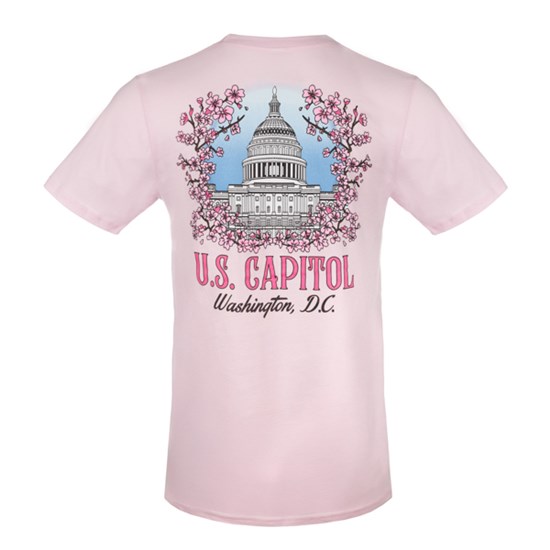 Enjoy the beauty of Washington, D.C., with this two-sided tee featuring the U.S. Capitol surrounded by vibrant cherry blossoms. The front showcases a minimalist white Capitol Dome framed by pink cherry blossoms. The back has an eye-catching and bold graphic featuring the iconic dome surrounded by detailed and vibrant pink cherry blossoms.